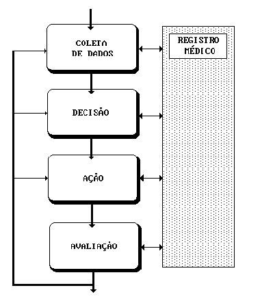 Estes três níveis de decisão são fortemente interrelacionados, e fazem parte de um ciclo repetitivo e auto-modificável de avaliação-decisão-ação-avaliação (Fig. 1). Em conseqüência, muitos programas de computador de apoio a decisão incluem os três aspectos como um todo. O primeiro e bem sucedido exemplo é o MYCIN, um programa desenvolvido nos Estados Unidos nos anos setenta, por Shortliffe e colaboradores [34], o qual é um sistema de apoio ao diagnóstico e terapia na área de infecções por microrganismos.