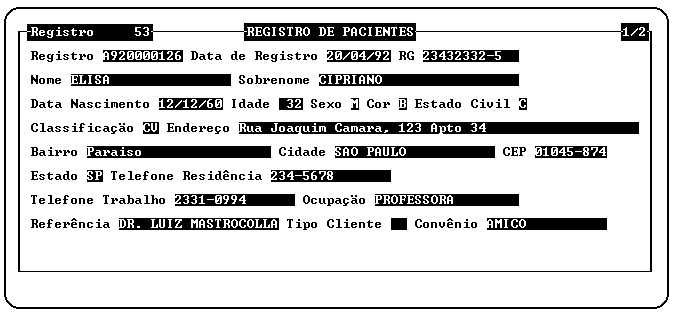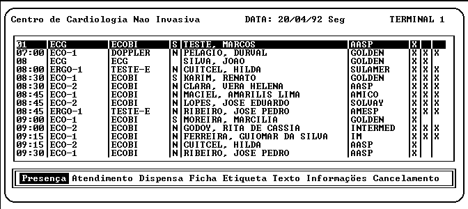 Permite informar quem será atendido no dia, em que hora, em que sala, e por quem (ou que procedimento será realizado), marcar sua presença, atendimento e dispensa, imprimir textos (por exemplo, atestados de presença, recibos, etc.), etiquetas de identificação, etc. Todas essas informações são visíveis e acessíveis simultaneamente na tela do monitor de vídeo de cada recepcionista (Fig. 5), permitindo fácil seleção e acesso.