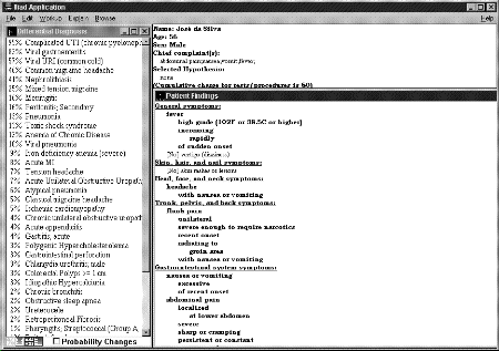 Sistemas baseados em modelos de causa-efeito. A base de conhecimento especifica associações do tipo: "um queda na pressão sangüinea causa aumento do tônus sistema simpático". Estes sistemas não são projetados para armazenar dados clínicos individuais. O mecanismo de inferência se baseia em cadeias de relações causais (exemplo: "se o paciente tem icterícia, então tem hiperbilirrubinemia, e se a bilirrubina não conjugada está aumentada, então há comprometimento hepático. Se há febre, então há infeccção viral ou bacteriana. Então pode tratar-se de uma hepatite"). Sistemas baseados em casos. A base de conhecimento especializada é formada por dados clínicos individuais, os quais relacionam casos típicos com os sinais e sintomas apresentados, achados laboratoriais, diagnóstico e tratamentos utilizados, e qualquer outro fator que o usuário possa achar interessante posteriormente. O mecanismo de inferência utiliza o raciocínio analógico, também muito usado pelos médicos ("se já tive um paciente com as mesmas condições e diagnóstico que esse, então o mesmo tratamento vai funcionar"). Todos os sistemas acima se baseiam em lógica, ou seja, o uso das proposições e teoremas que consistem o fundamento do raciocínio do tipo verdadeiro/falso. Exemplos de Sistemas Especialistas MédicosO Quick Medical Reference System (QMR) é um programa que realiza o diagnóstico diferencial em muitas áreas da Medicina Interna, e também é útil para ensino (deve-se notar, no entanto que o programa tem um grau de profundidade limitado em várias áreas, como nas doenças cardiovasculares) O desempenho do sistema foi testado com 31 casos não solucionados dos serviços médicos de dois hospitais universitários. O diagnóstico obtido com o sistema foi comparado com a melhor hipótese diagnóstica fornecida pelo médico que atendia os casos. O padrão-ouro (diagnóstico definitivo) foi o obtido para os 20 casos que foram resolvidos depois de um seguimento de seis meses. Os resultados foram os seguintes: o médico acertou 80 % dos casos resolvidos, o sistema QMR acertou 85 % (uma diferença não significativa em relação ao médico), e os médicos que não cuidavam do caso (residentes, por exemplo), acertaram apenas 60 % dos diagnósticos (uma diferença significativa em relação ao médico que cuidava dos casos e do sistema especialista), comprovando que o QMR tem desempenho semelhante ao do especialista nos casos tratados. O trabalho de avaliação foi publicado em Annals of Internal Medicine. 1989; 110(10):824-832). O programa QMR está comercialmente disponível através da Camdat Corp., Tel. 1-800/875-8355. Outro sistema especialista muito utilizado é o Iliad, desenvolvido pelo Departamento de Informática Médica da Universidade de Utah em Salt Lake City. Como o QMR, tem abrangência em Medicina Interna, mas utiliza um sistema diferente de inferência. Além da lógica, utiliza também probabilidades, através do teorema de Bayes. Tela de diagnóstico diferencial de Iliad, um sistema especialista em Medicina Interna Clique na imagem para ver em maior detalhe Um compêndio de sistemas de inteligência artificiais em uso clínico rotineiro está disponível na Internet (http://www-uk.hpl.hp.com/people/ewc/list.html). Inclui sistemas de atenção aguda, sistemas educacionais, sistemas de laboratório, controle de qualidade e sistemas de administração, e sistemas de imagens médicas. Outros exemplos de sistemas são: