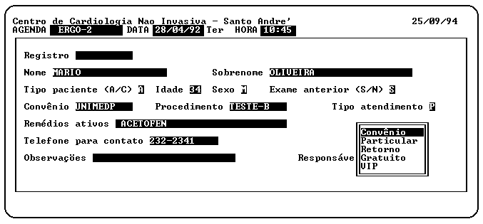 Permite informar quem será atendido no dia, em que hora, em que sala, e por quem (ou que procedimento será realizado), marcar sua presença, atendimento e dispensa, imprimir textos (por exemplo, atestados de presença, recibos, etc.), etiquetas de identificação, etc. Todas essas informações são visíveis e acessíveis simultaneamente na tela do monitor de vídeo de cada recepcionista (Fig. 5), permitindo fácil seleção e acesso.