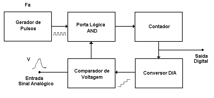 Existem diversos tipos de conversores A/D, de acordo com a técnica utilizada para realizar medidas discretas de voltagem ou corrente de um sinal. As duas técnicas mais comuns são a de aproximações sucessivas e a das comparações sucessivas, ou gerador de rampa. A mais usada é esta última, e funciona da seguinte maneira (Fig. 3):