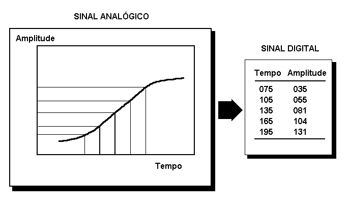 No canal de registro digital, os primeiros elementos são idênticos aos do canal analógico, ou seja, são necessários, da mesma forma, o elemento de captação (ou sonda), o transdutor (ou sensor), e o amplificador analógico. A partir daí, o registrador é substituido por um computador, com seus periféricos, que será usado para converter, armazenar, exibir e/ou registrar o sinal ou sinais provenientes dos canais de entrada. Para que isso aconteça, entretanto, é necessário transformar o sinal original, que geralmente é analógico por natureza (ou seja, varia continuamente em amplitude e no tempo), em números discretos (dígitos), que é a maneira com que o computador trabalha com quantidades numéricas. Isso equivale a tomar medidas de amplitude do sinal, em intervalos regulares, e converter essas medidas em números digitais com certo grau de precisão. Esse processo é chamado de digitalização, ou amostragem do sinal no tempo (Fig. 2), e, técnicamente, é realizado por um circuito eletrônico especializado (geralmente uma placa que se acopla internamente ao microcomputador), chamado conversor analógico-digital, ou conversor A/D.
