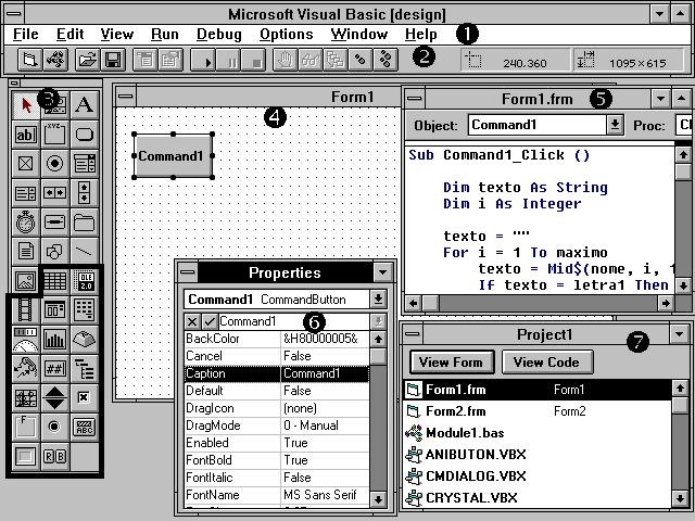 O VB contém um ambiente completo para o desenvolvimento de aplicativos Windows, que inclui ferramentas para o desenho de janelas e elementos visuais, dentro dos padrões do ambiente gráfico, bem como para a codificação, depuração, teste, execução e distribuição de programas. O aspecto geral do ambiente de desenvolvimento do VB, e de seus elementos componentes, pode ser examinado na Figura 1.